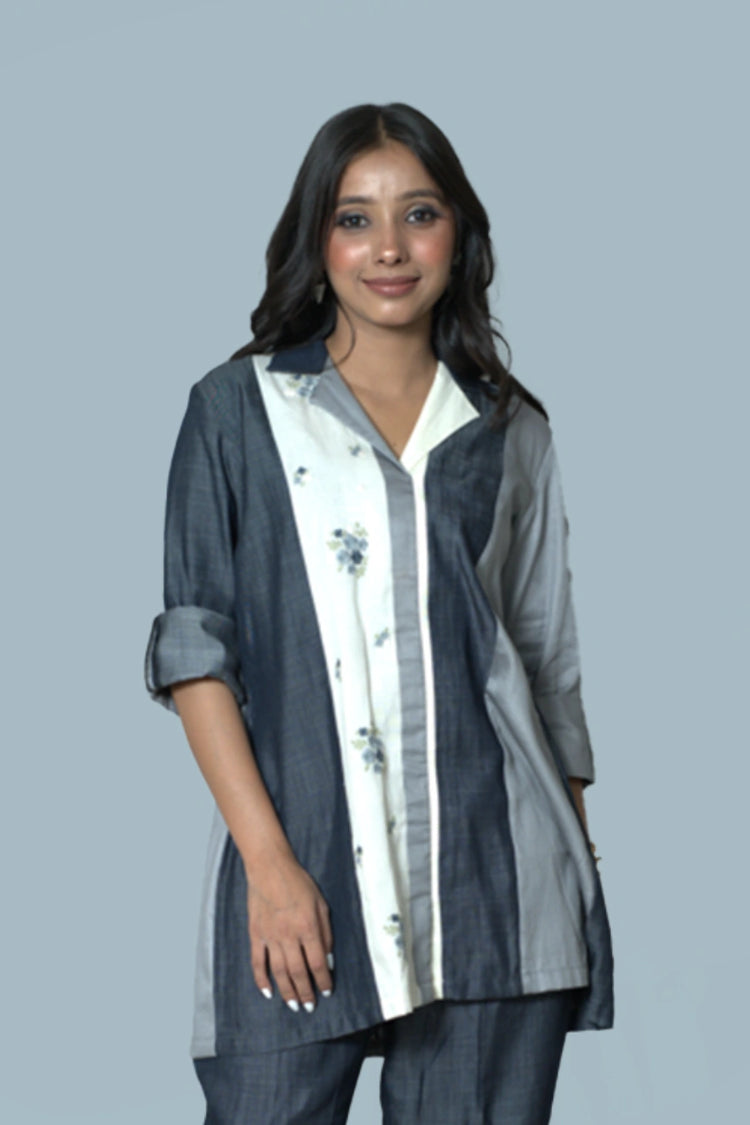Grey & Ivory Dual-Tone Floral Co-Ord Set Modern Minimalist Fusion wear. A stunning combination of deep charcoal grey, soft slate blue, and a contrasting panel of ivory white at the center. Blend of cotton-linen or chambray-style material – breathable yet slightly structured. Straight-cut, long shirt style with a relaxed fit....