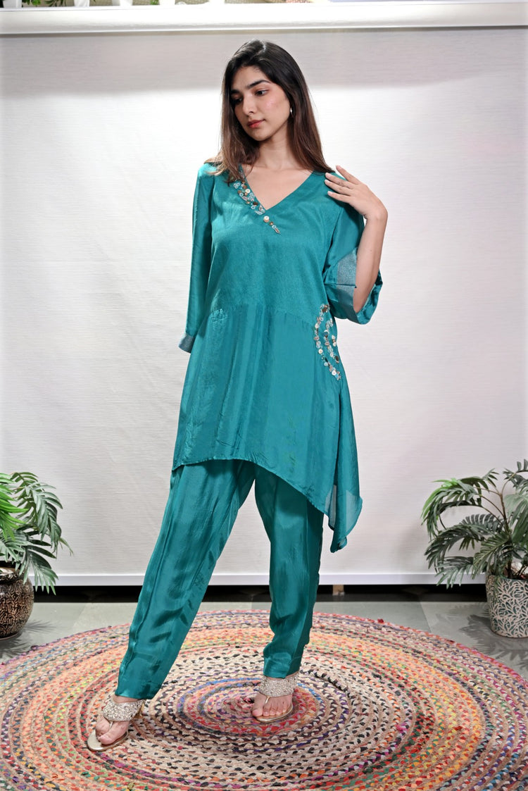 A stunning turquoise blue shade, offering a cool, vibrant, and graceful . Perfect for both daytime and evening events. The kurta features an uneven hem that adds a modern, flowy flair to the traditional silhouette. Flowy and relaxed, allowing comfort with a graceful fall. V-neckline embellished with Western work and...